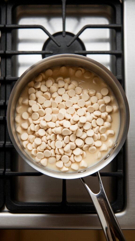In a medium saucepan, pour in 3 cups white chocolate chips and the full 14 oz can of sweetened condensed milk. Don’t turn on the heat yet.