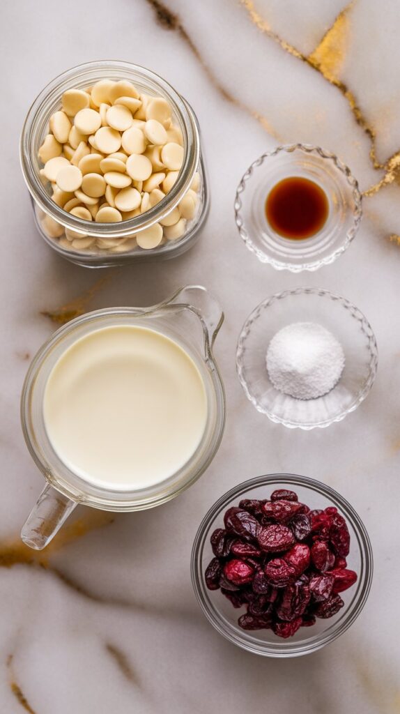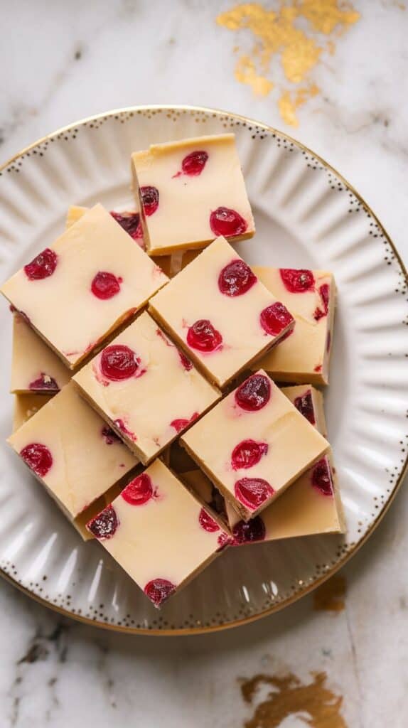 The sweetened condensed milk helps the white chocolate melt smoothly without seizing. It also sets up thick and creamy once chilled. The dried cranberries keep their texture and don’t release moisture, so they don’t mess with the fudge consistency.