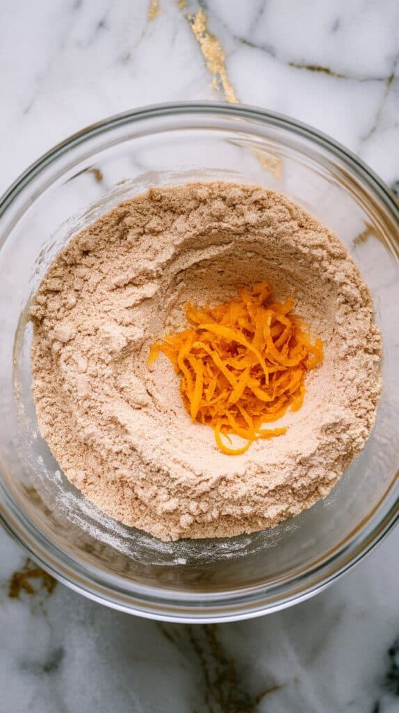 In a large mixing bowl, whisk together 2 cups all-purpose flour, 1/2 cup granulated sugar, 1/4 cup packed brown sugar, 2 tsp baking powder, 1/2 tsp baking soda, and 1/2 tsp salt. Stir in 1 tbsp orange zest.