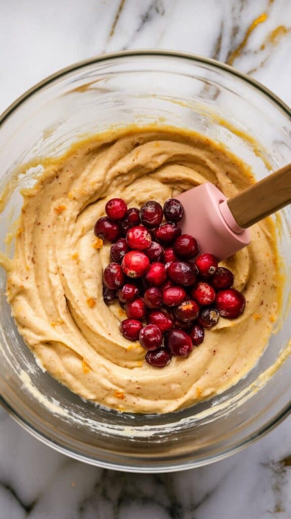 Fold 1 1/2 cups fresh cranberries into the batter with a spatula.