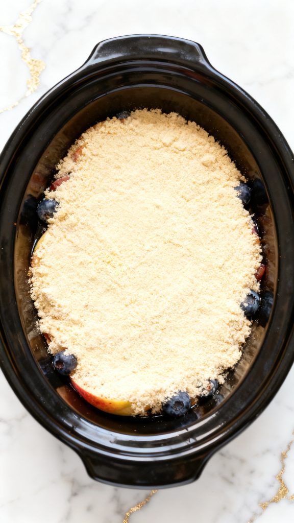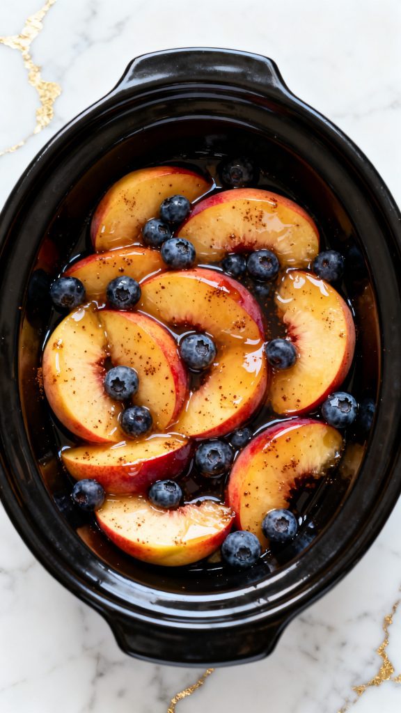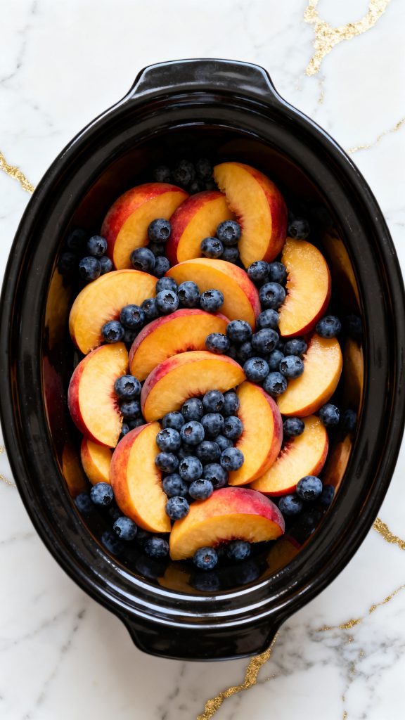 Add 4 cups sliced peaches and 1 1/2 cups blueberries to the black oval crockpot. Spread the fruit into an even layer.