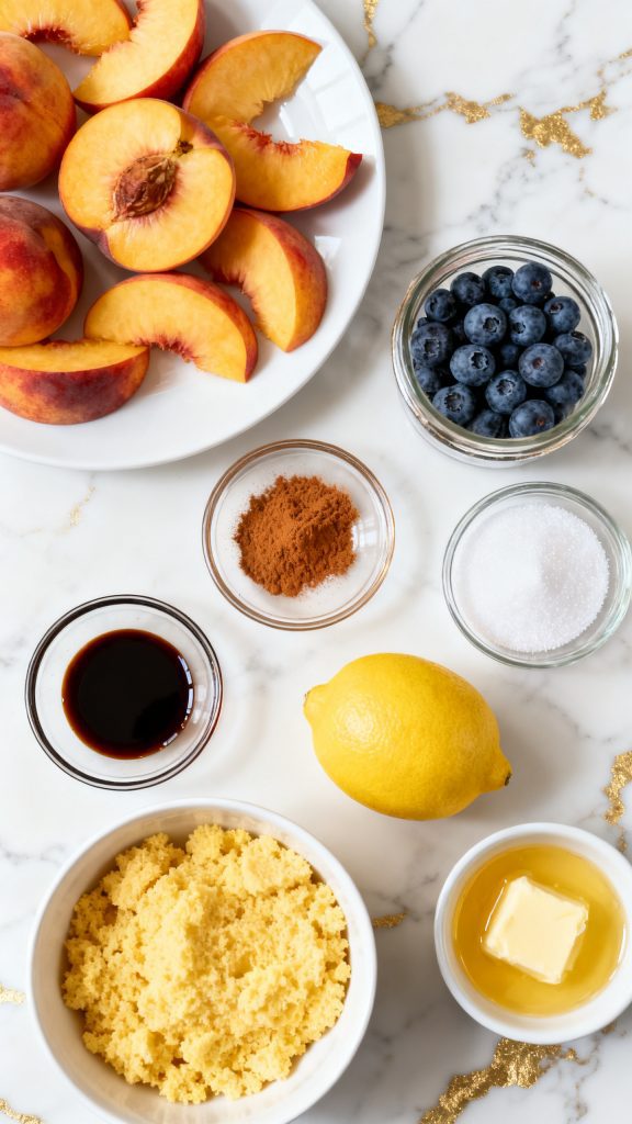 Sprinkle 1/3 cup sugar, 1 teaspoon cinnamon, 1 tablespoon lemon juice, and 1 teaspoon dark liquid vanilla extract over the sliced peaches and blueberries. Stir gently until the fruit is coated.