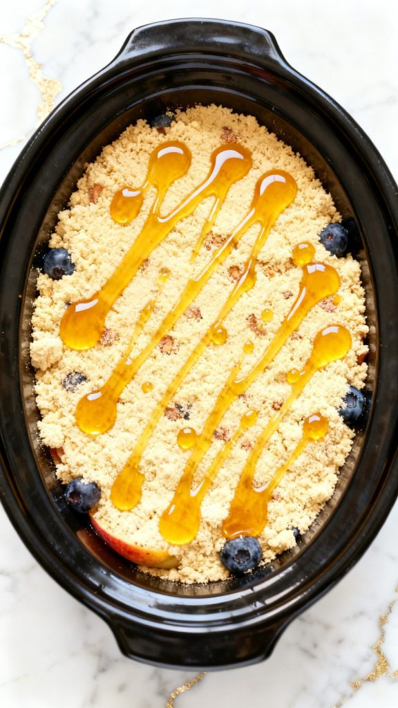 The fruit releases juice as it cooks. Sugar helps pull out more juice and makes the sauce sweet. The cake mix soaks up butter and fruit juice, so it turns soft and cobbler-like. The slow heat keeps the fruit tender without drying it out.