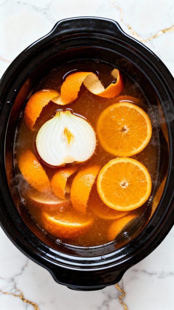 You can prep everything the night before — slice the orange, measure the spices, and refrigerate the cider with caramel sauce stirred in. In the morning, just dump it all into the Crockpot and turn it on.