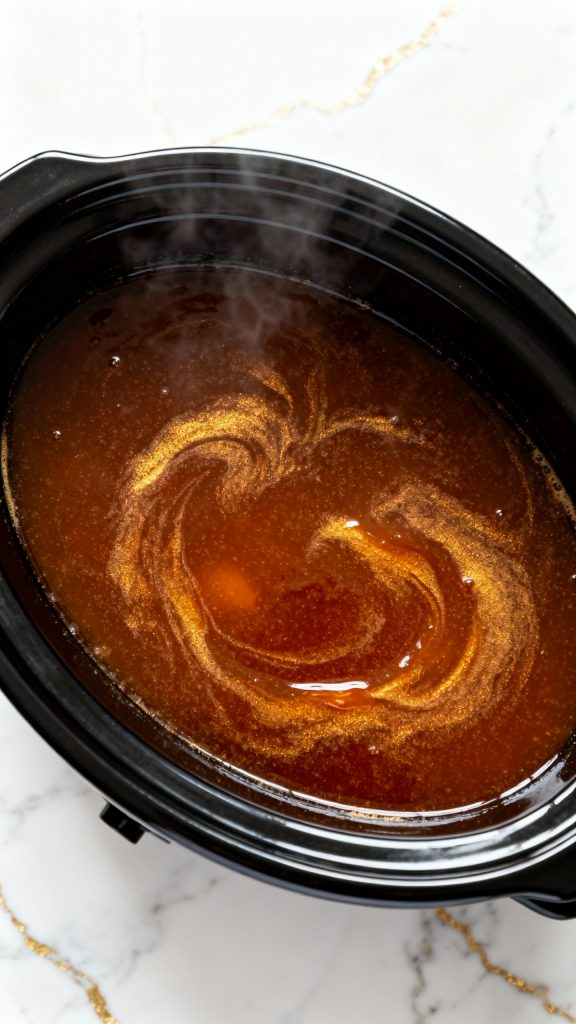 Step 1: Add Apple Cider and Caramel Sauce to Crockpot