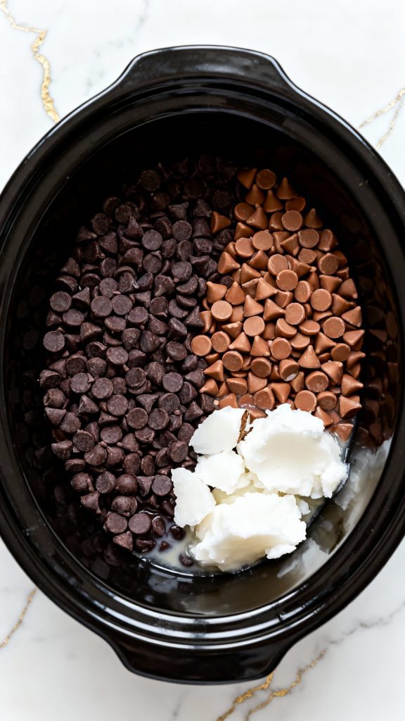 Pour 2 cups semi-sweet chocolate chips, 1 cup milk chocolate chips, and 2 tablespoons coconut oil into the slow cooker.