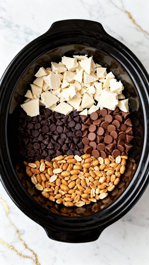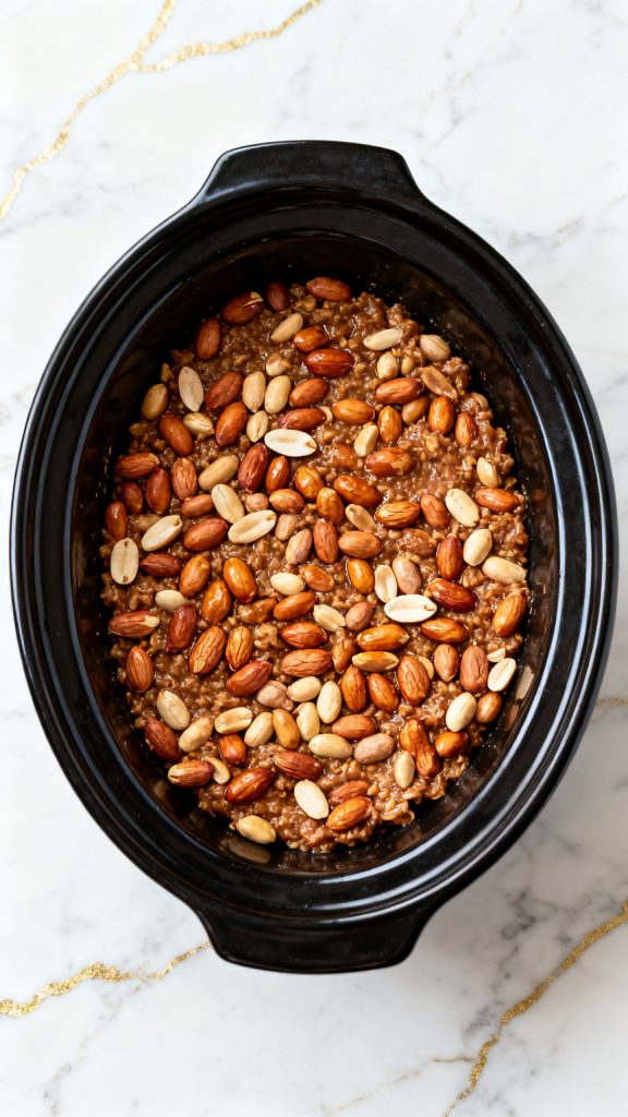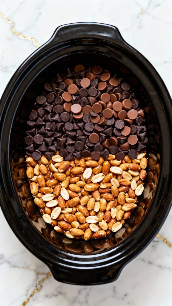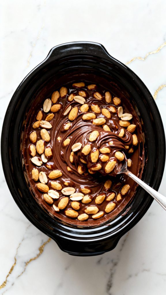 The low, even heat of the crockpot gently melts the chocolate and almond bark without burning it. Using both salted and unsalted peanuts keeps the flavor balanced—just the right amount of saltiness. Almond bark helps the clusters harden properly at room temp, giving them that perfect bite.