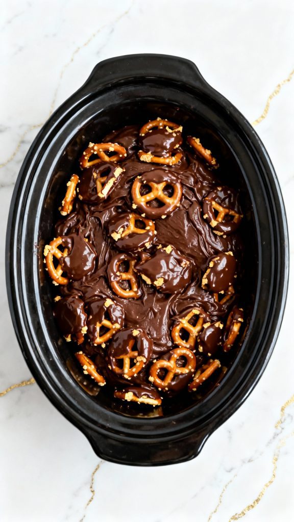 These Crockpot Chocolate Pretzel Clusters are rich, melty chocolate mixed with the crunch of salty pretzels — and they’re so easy.
