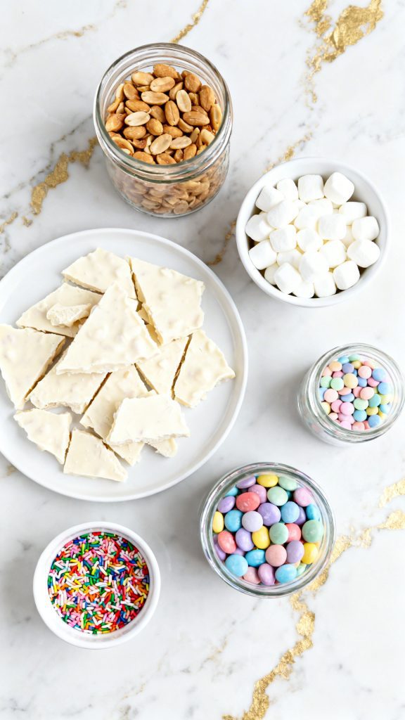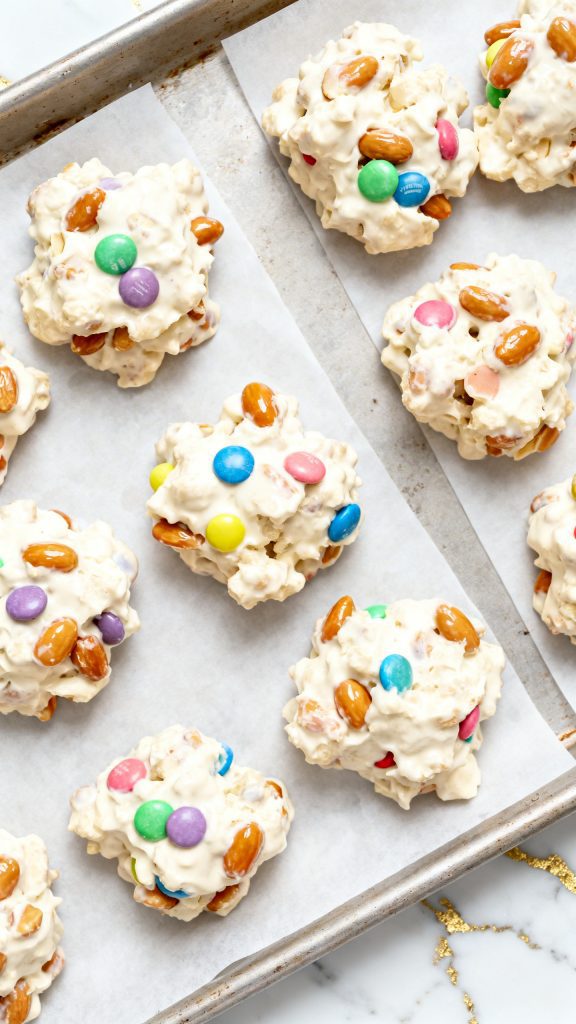Top each candy cluster with the remaining ½ cup Easter M&Ms and 2 tablespoons Easter sprinkles.