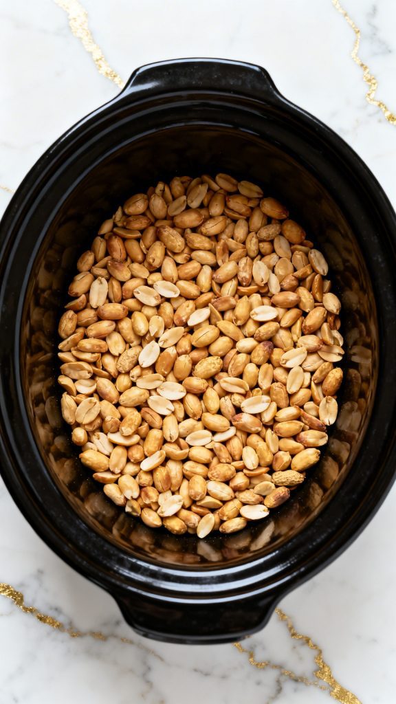 Pour 32 ounces dry roasted salted peanuts into the black oval crockpot, spreading them evenly across the bottom.