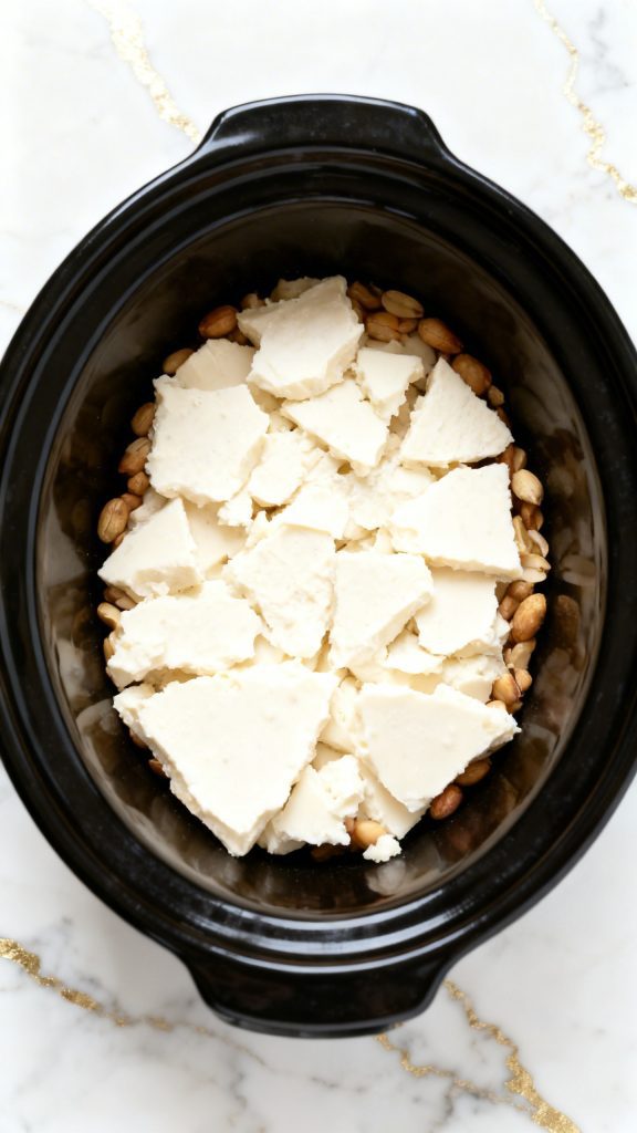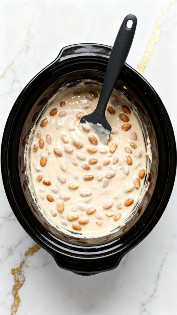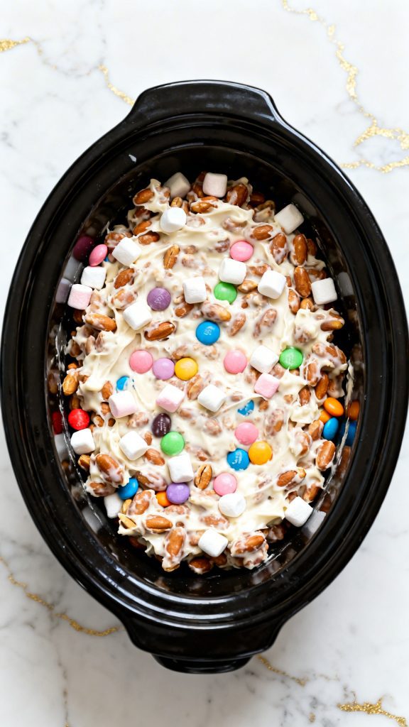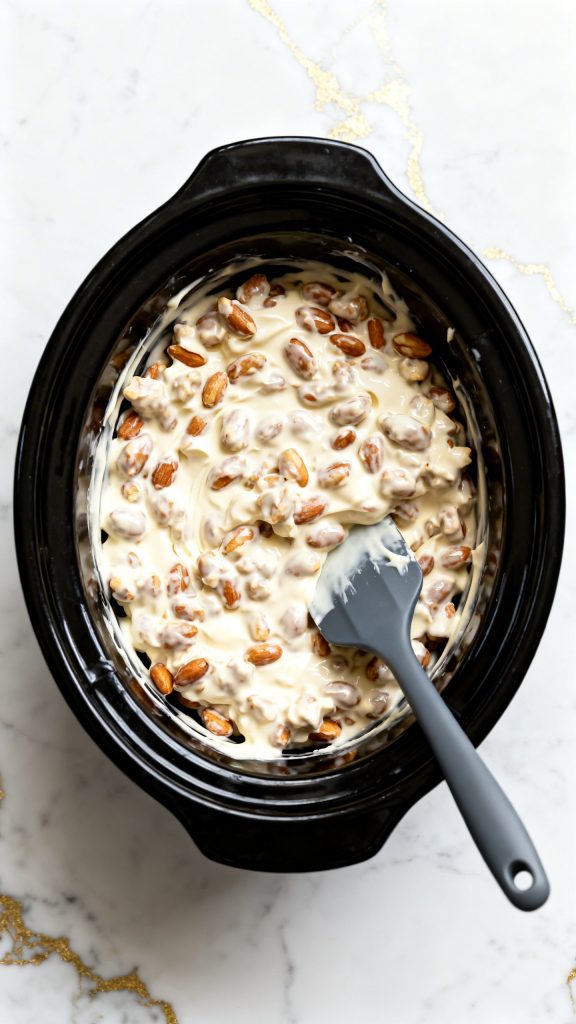 After the first hour, stir the mixture. Continue cooking 1 more hour on LOW, stirring every 20 minutes, until the almond bark becomes fully melted and creamy and evenly coats the peanuts.
