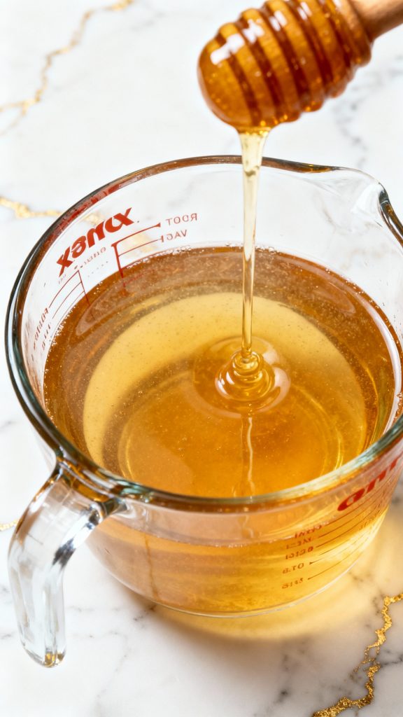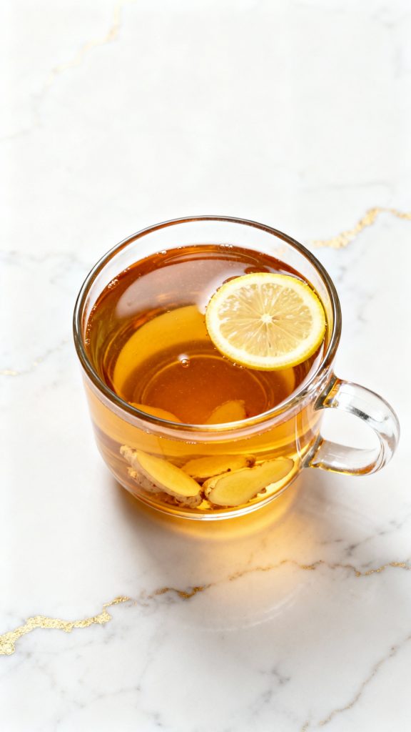 Once the honey is fully dissolved, pour the tea into a round clear glass mug. Garnish with a lemon slice or a few soft ginger pieces. The tea should look golden, clear, and gently glossy—warm, soothing, and ready to enjoy.