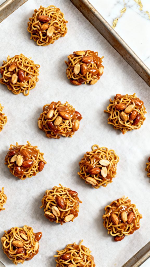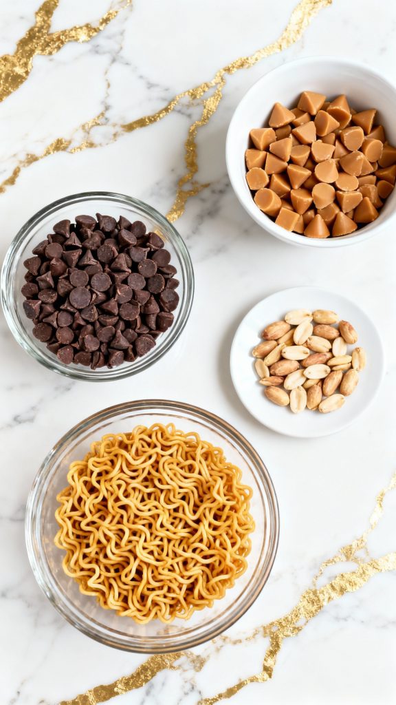 The butterscotch chips contain sugar and milk solids that give a creamy texture when melted. Combining them with chocolate chips creates a balanced sweet base. The chow mein noodles add structure and crunch without getting soggy, and the peanuts bring in salt and extra texture—so you get that sweet-salty-crispy bite every time.
