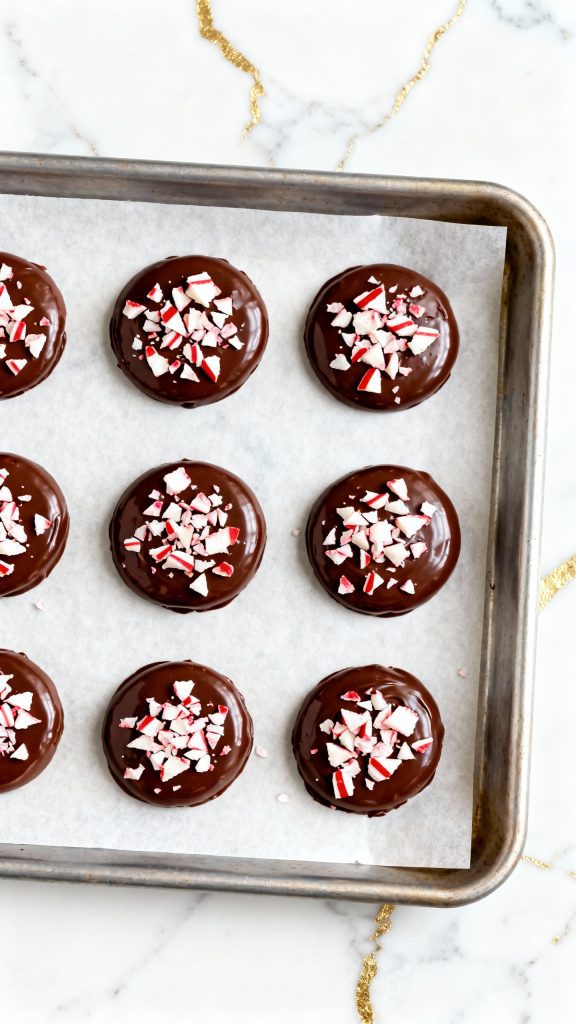 Before the chocolate cools, quickly sprinkle about ¼ cup of crushed peppermint candies over the top of each scoop.