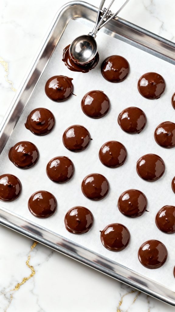 Line a baking sheet with parchment paper. Use a spoon or small cookie scoop to drop small rounds of the melted chocolate mixture onto the sheet.