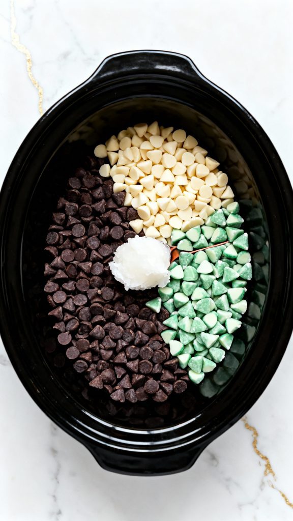 Add 1 (12 oz) bag of semi-sweet chocolate chips, 1 (12 oz) bag of white chocolate chips, and 1 (10 oz) bag of Andes Creme de Menthe chips to the bottom of the crockpot. Sprinkle 1 tablespoon of coconut oil over the top.