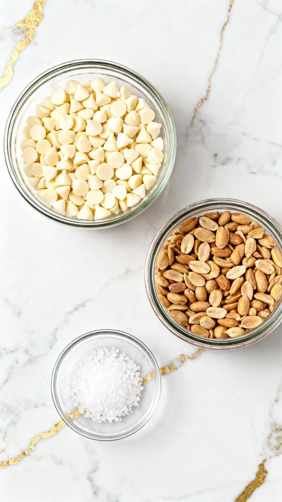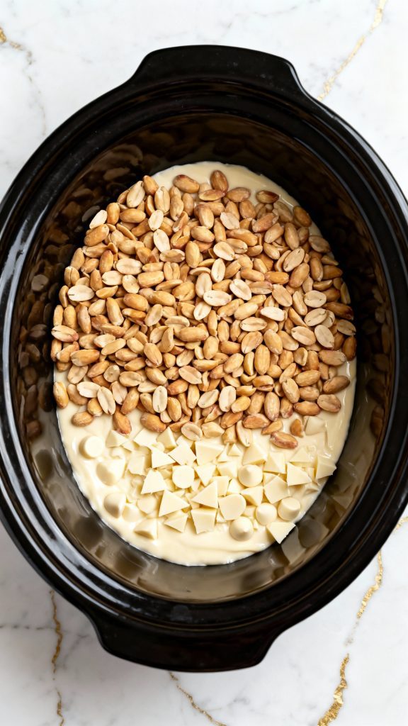White chocolate melts at a lower temp than dark or milk, so using a crockpot keeps the heat gentle and even — no risk of burning. Peanuts are dry roasted, which means they stay crunchy even after being coated. The salt helps balance the sweetness and enhances the chocolate flavor.