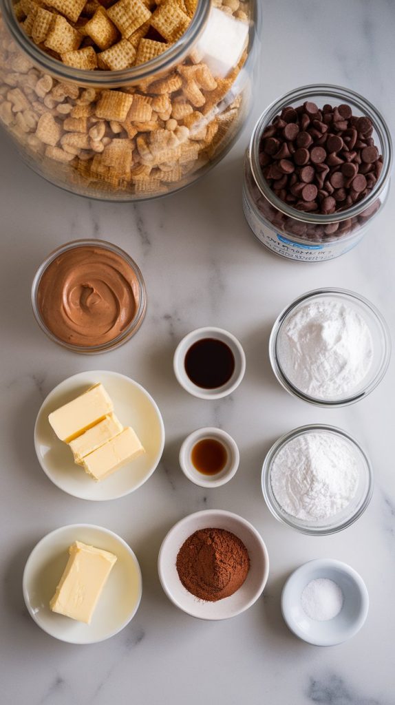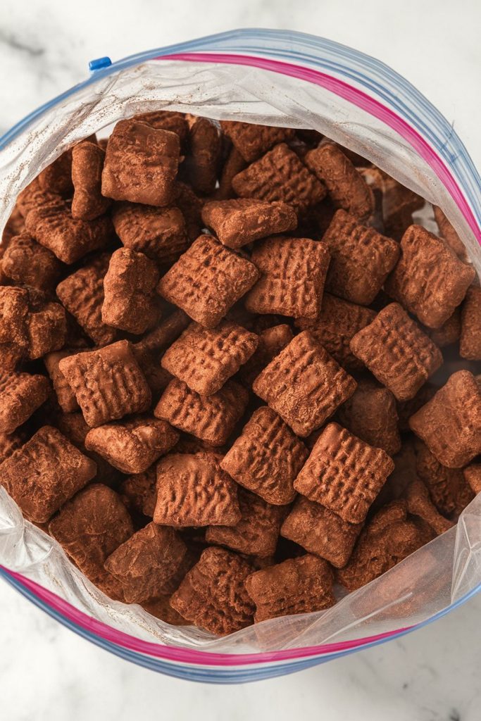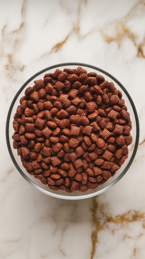 The mix of powdered sugar, cocoa powder, and brownie mix sticks perfectly to the slightly warm chocolate-coated cereal because of the fat content and residual moisture. Peanut butter adds creaminess and helps the chocolate melt smooth, while the Chex holds its crunch and doesn’t collapse under the weight of the coating. The Dutch-process cocoa gives it that deep chocolate flavor without bitterness.