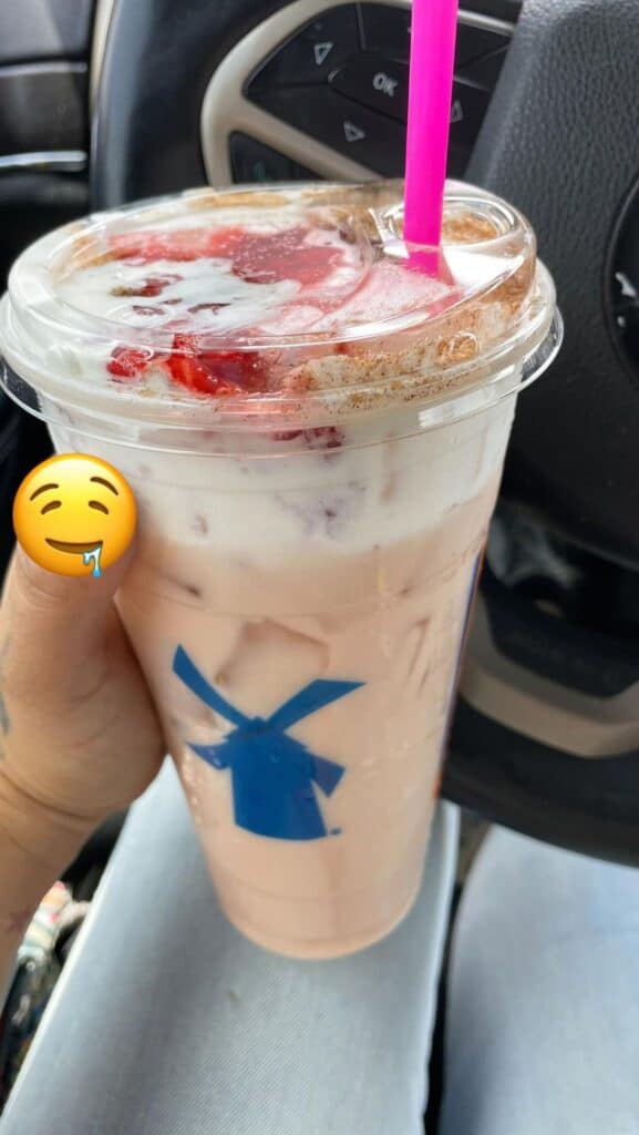 The horchata chai base offers warm spices, while the real strawberry fruit adds a fresh twist. Topped with a soft, fluffy foam and a sprinkle of cinnamon, it’s a balanced and tasty treat.