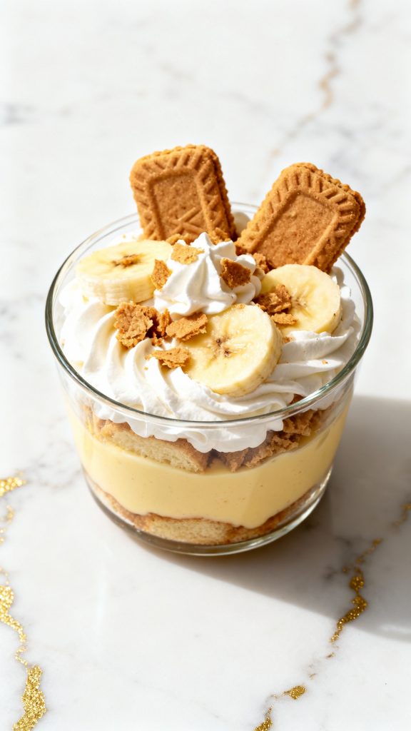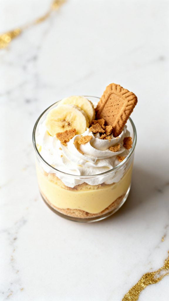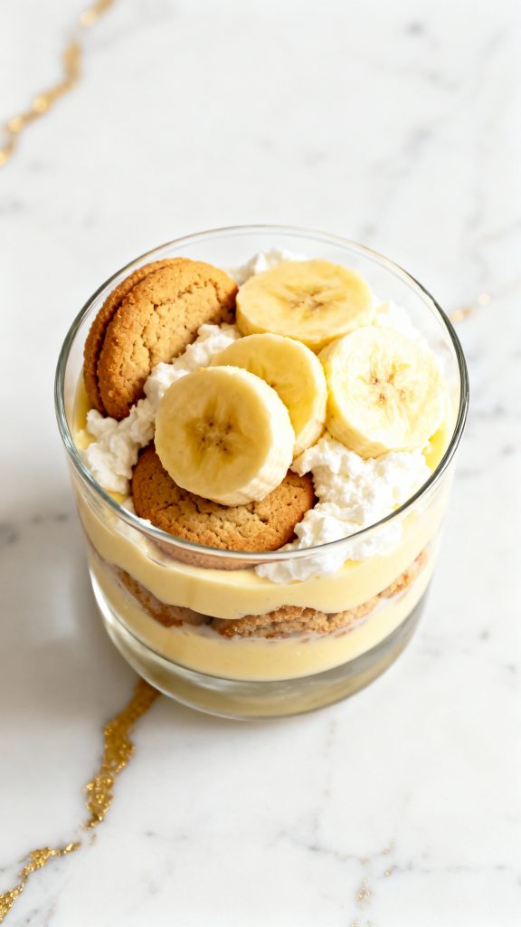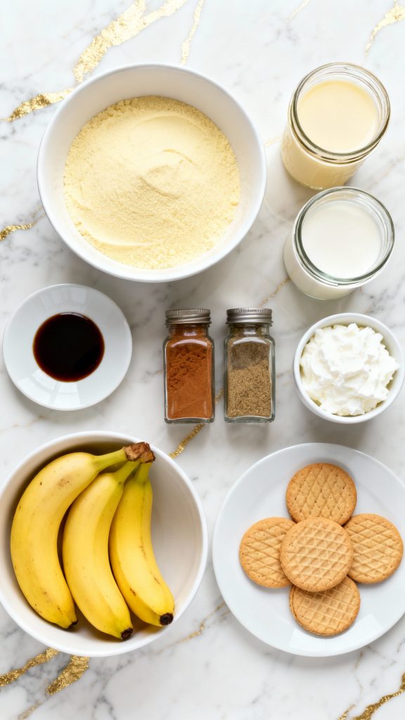 top-down shot of all ingredients on a white marble counter with hints of gold: instant vanilla pudding mix in a white bowl, cold eggnog in a clear jar, cold milk in a small clear jar, vanilla extract in a small round white plate, ground cinnamon and ground nutmeg in clear spice jars, sweetened condensed milk in a clear jar, heavy whipping cream in a white bowl, whole ripe bananas in a white bowl, vanilla wafer cookies on a white round plate — everything neatly arranged, a straight 90-degree top-down shot with no tilt, captured directly overhead