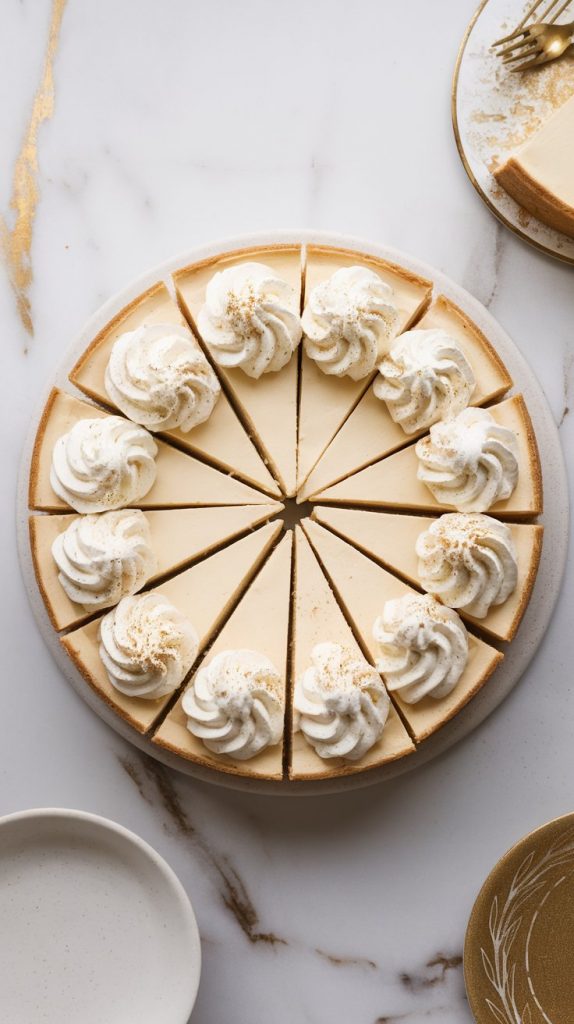 Unmold the chilled cheesecake, spread or pipe the nutmeg whipped cream on top, and dust lightly with extra nutmeg. Slice and serve.