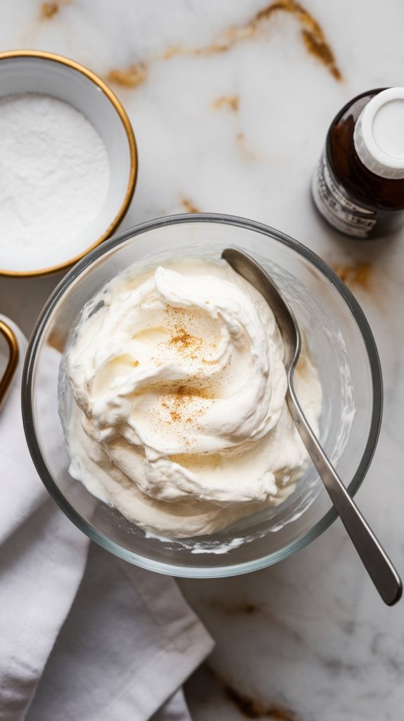 In a cold bowl, beat 1 cup heavy whipping cream with 2 tbsp powdered sugar, ¼ tsp ground nutmeg, and ½ tsp vanilla extract until soft peaks form.