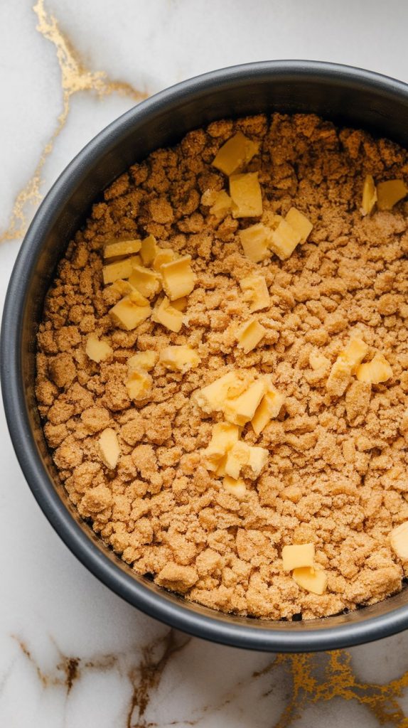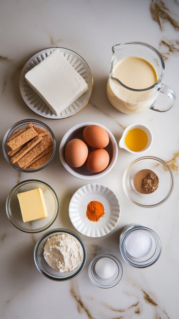 Mix 1 ½ cups graham cracker crumbs, ¼ cup granulated sugar, ½ tsp ground cinnamon, and 6 tbsp melted unsalted butter in a bowl until it looks like wet sand. Press firmly into the bottom of a 9-inch springform pan. Chill in the fridge while you make the filling.