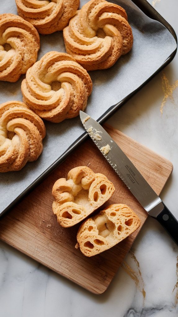 - Use a sharp knife to slice the puffs once they’re fully cooled