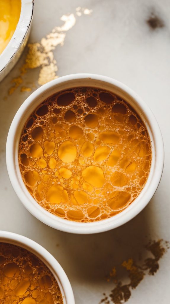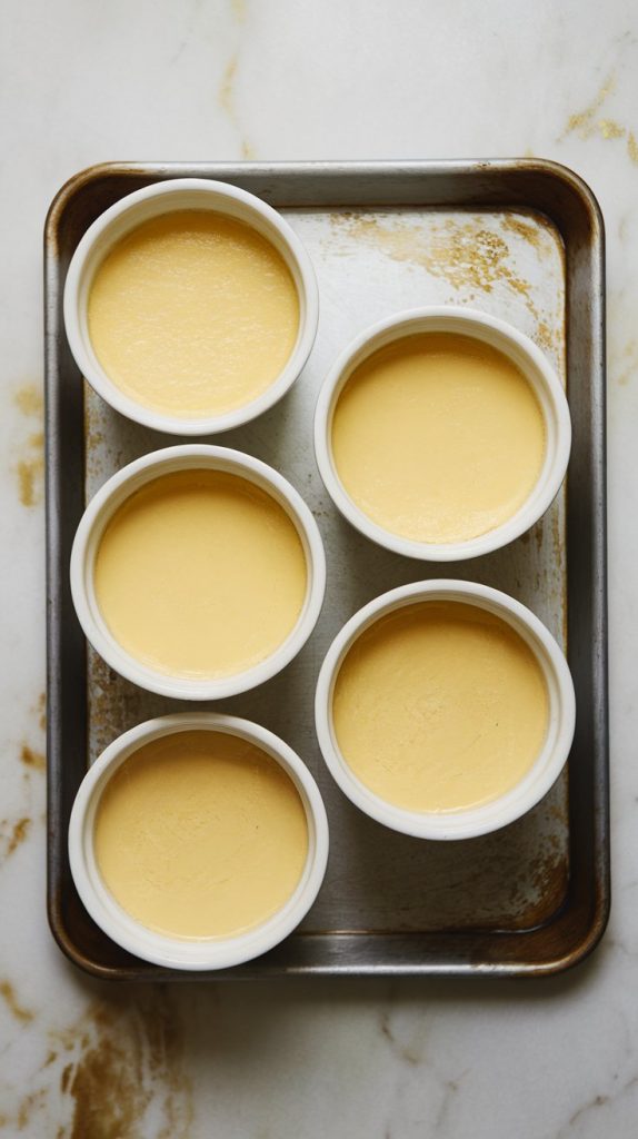 Place 4 ramekins in a deep baking dish. Pour custard evenly into each ramekin. Add hot water to the dish so it comes halfway up the sides. Bake at 325°F (160°C) for 35–40 minutes until the centers are just set.