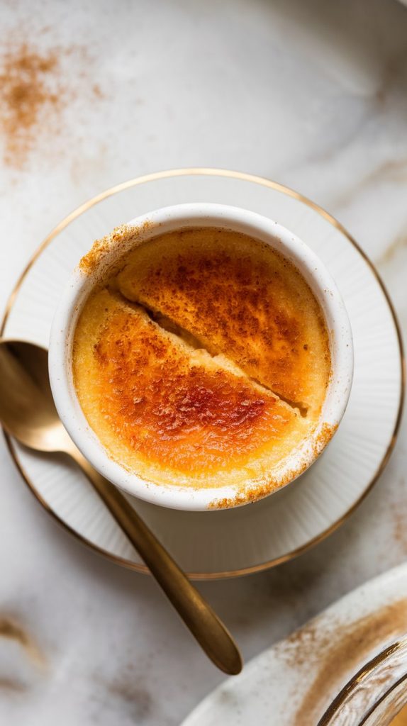 Right before serving, sprinkle 1 tablespoon of granulated sugar over each custard. Use a torch to caramelize, or place under a broiler until melted and golden.