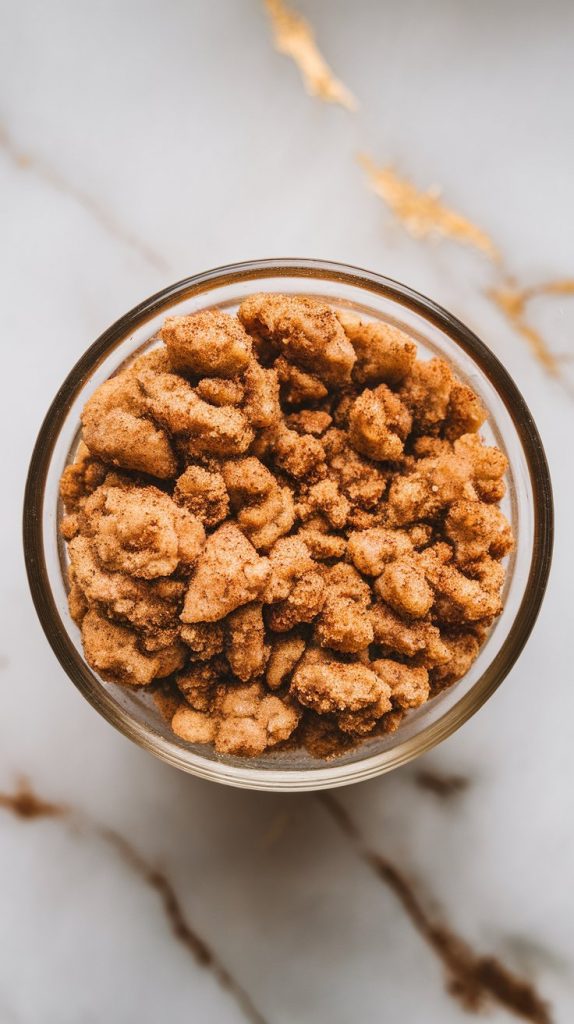 In a small bowl, stir together ½ cup flour, ⅓ cup brown sugar, ¼ tsp cinnamon, ¼ tsp nutmeg, and ¼ cup melted butter until the mixture resembles wet sand.