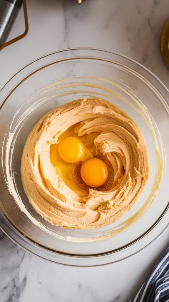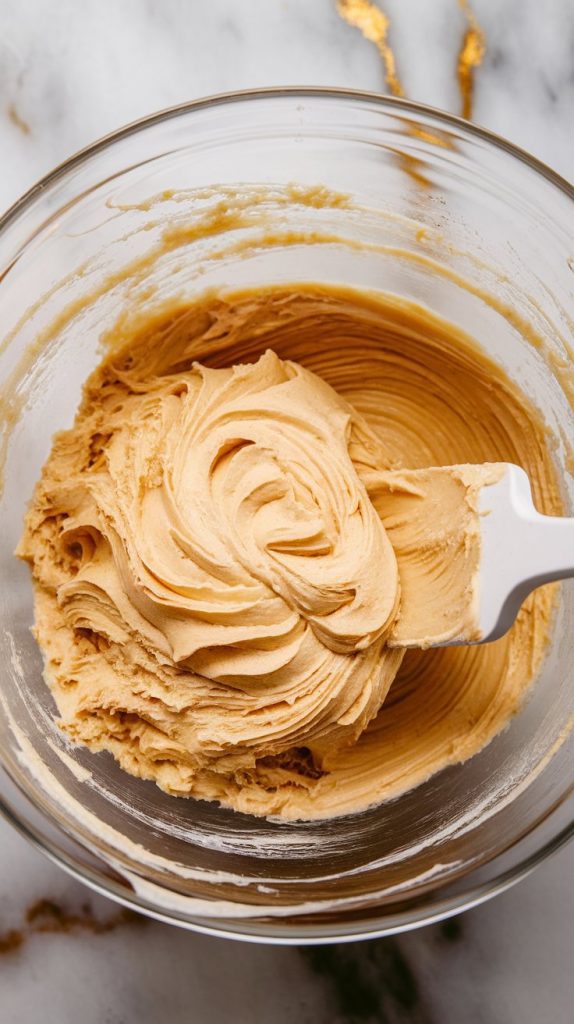 In a bowl, beat ½ cup softened butter with 3 tbsp caramel sauce and 1 tbsp eggnog. Add 2 cups powdered sugar and a pinch of salt. Beat until smooth and fluffy.