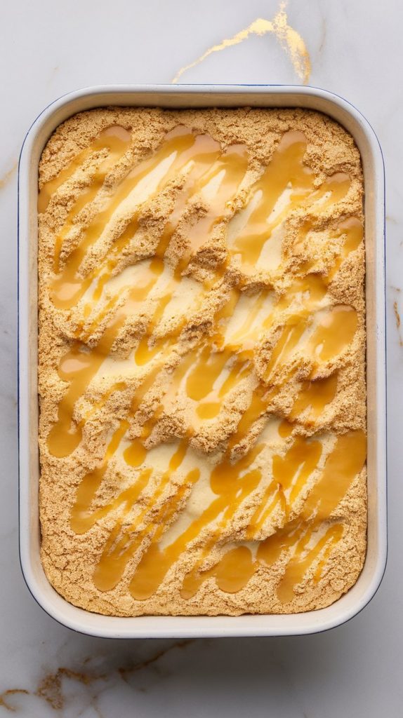 Slowly drizzle 1/2 cup of melted butter over the dry cake mix, covering as much as possible. Do not mix.