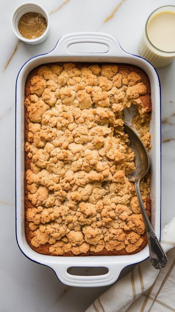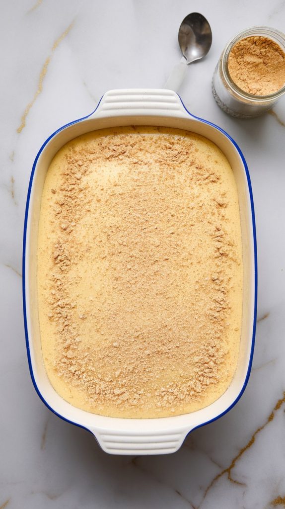 Dump cakes work thanks to layering. The eggnog, eggs, and sugar bake into a custard on the bottom. The dry cake mix absorbs moisture from below and steam from the oven. The butter melts into the mix, giving you that classic crumbly topping. The chemical reactions between the egg proteins and heat thicken the base like a soft pudding while the cake mix rises just enough to create structure.