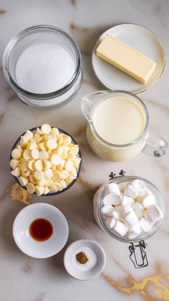 The combo of sugar, butter, and eggnog forms a creamy base that holds structure when cooled. White chocolate and marshmallow creme give the fudge its silky texture. The marshmallow also helps it set without needing a candy thermometer.