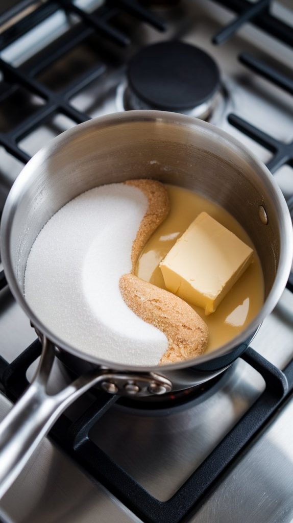 In a medium saucepan over medium heat, combine 2 cups granulated sugar, ½ cup unsalted butter, and ¾ cup eggnog. Stir constantly until the butter melts and the mixture comes to a gentle boil.