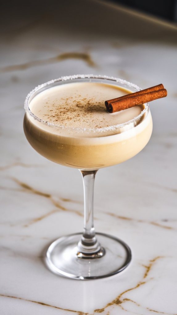 Eggnog is rich and fatty, which balances the sharpness of alcohol. Vanilla vodka adds a soft, smooth warmth, while amaretto gives that nutty holiday flavor. The white crème de cacao adds chocolatey depth without overpowering. Shaking it with ice chills and blends it fast, giving you that frothy top layer.