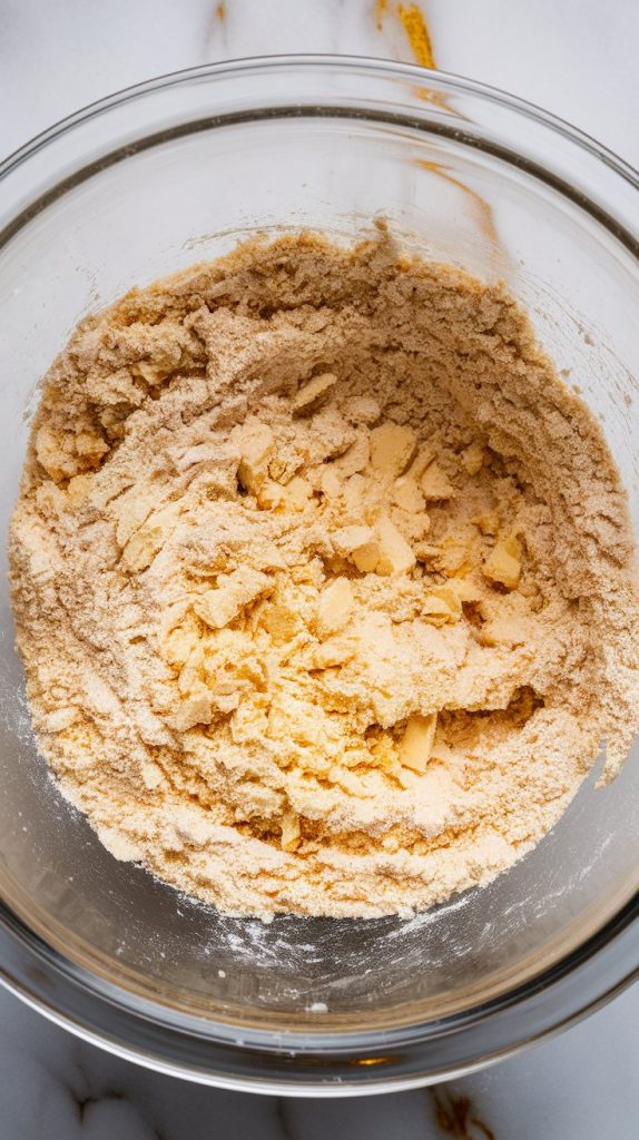 Add ½ cup cold unsalted butter (diced) to the flour mixture. Use a pastry cutter or your fingers to work the butter in until it looks like coarse crumbs.