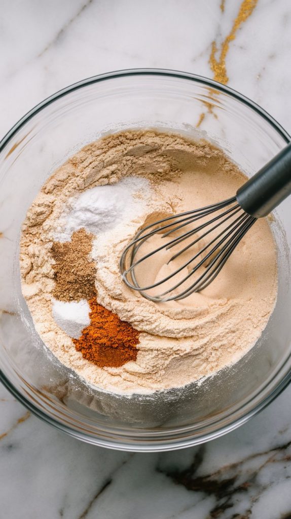 In a large mixing bowl, whisk together 2 cups all-purpose flour, 1 tbsp baking powder, ¼ tsp salt, ½ tsp ground nutmeg, ½ tsp ground cinnamon, and ⅓ cup granulated sugar.