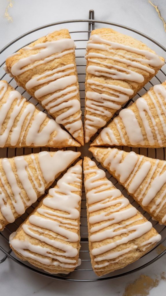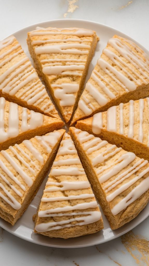 Place scones on a serving plate and enjoy warm or room temp. The inside should be tender and lightly spiced, with a sweet glaze on top.