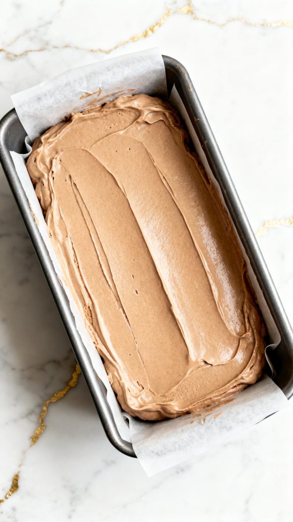 Line a loaf pan or freezer-safe container with parchment paper if you want easier scooping later. Pour the smooth espresso mixture into the pan and spread it into an even layer with a rubber spatula.