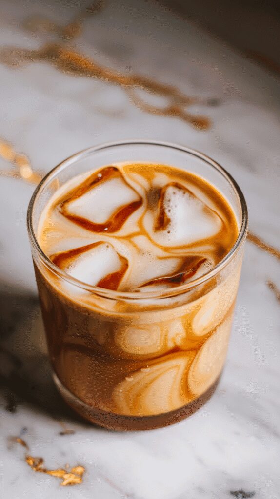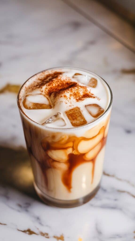 This iced drink combines espresso with apple syrup and oat milk for a dairy-free, lightly spiced sip. It’s cool, crisp, and easy to enjoy.