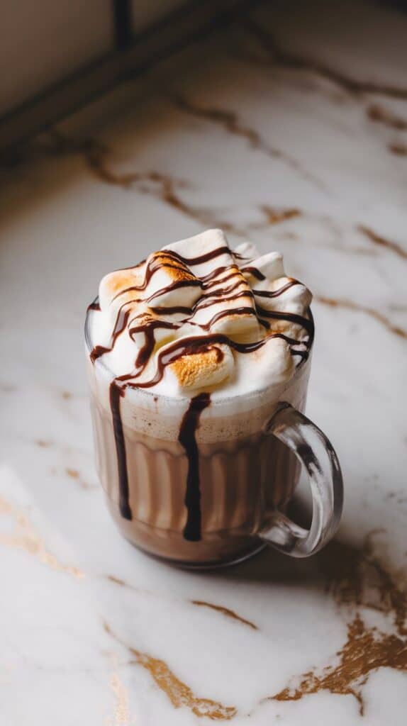 Chocolate, marshmallow syrup, and espresso are topped with whipped cream and toasted mini marshmallows for a rich, cozy drink.