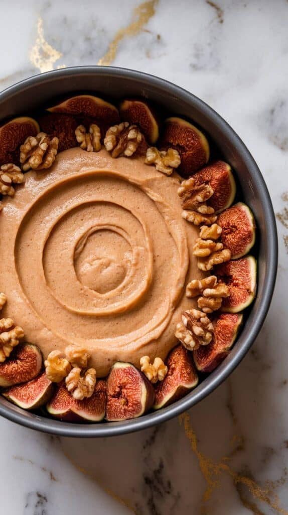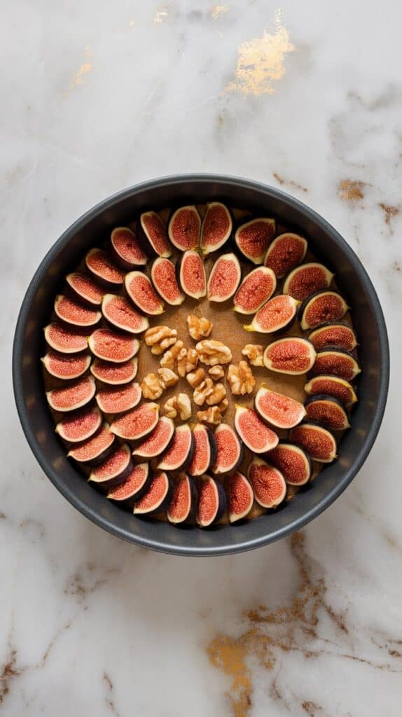 In a small bowl, stir together ½ cup melted unsalted butter and ½ cup packed brown sugar. Pour this mixture into the bottom of a greased 9-inch round cake pan. Arrange 6 sliced fresh figs on top in a circular pattern. Sprinkle ½ cup chopped walnuts over the figs.