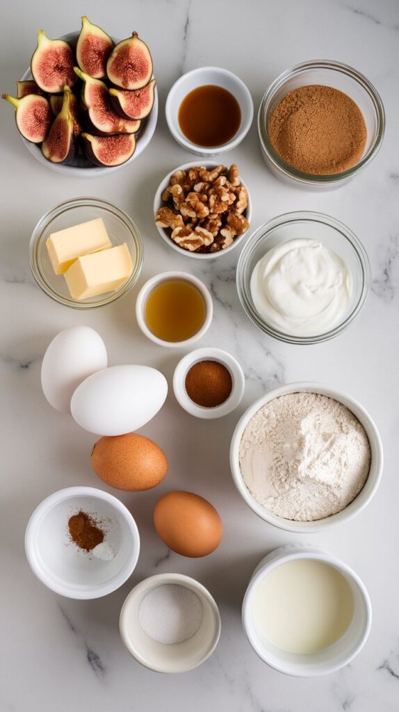 The melted butter and brown sugar create a caramel layer that soaks into the cake while baking upside-down. Figs release moisture and sugars, helping form a glossy topping. Sour cream adds fat and acidity, which makes the cake tender and balanced. Baking soda and powder give it lift, while the warm spices flavor the crumb.