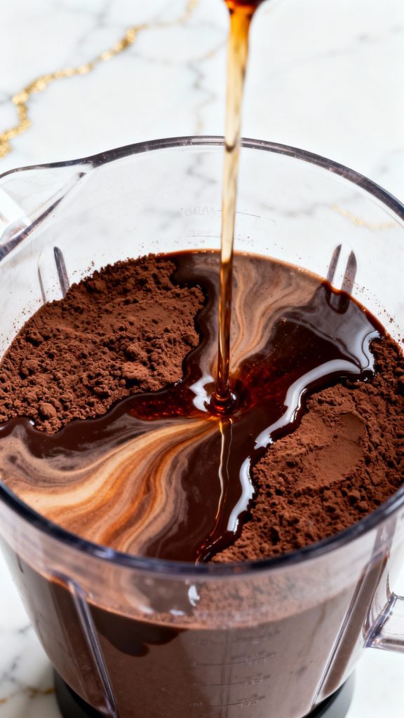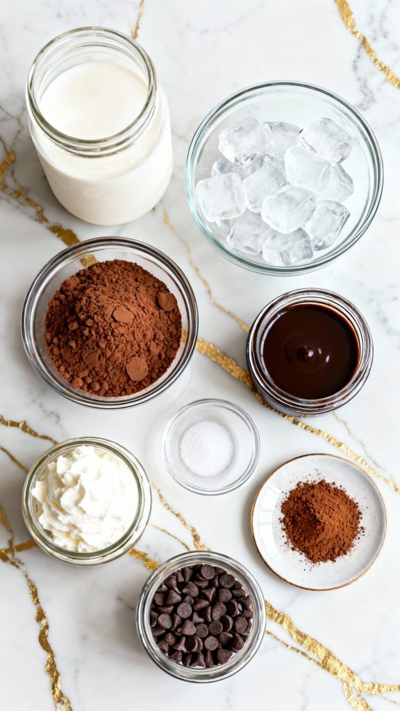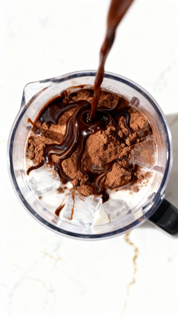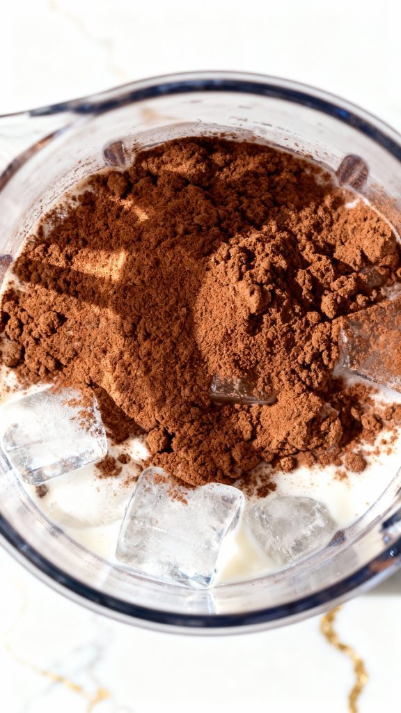 The ice gives it the frosty texture, the milk makes it creamy, and the chocolate syrup plus hot cocoa mix double down on the chocolate flavor. Blending emulsifies everything so you get that milkshake-like body, even without ice cream.