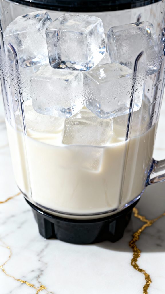 Add 1 cup ice cubes right into the blender on top of the milk.