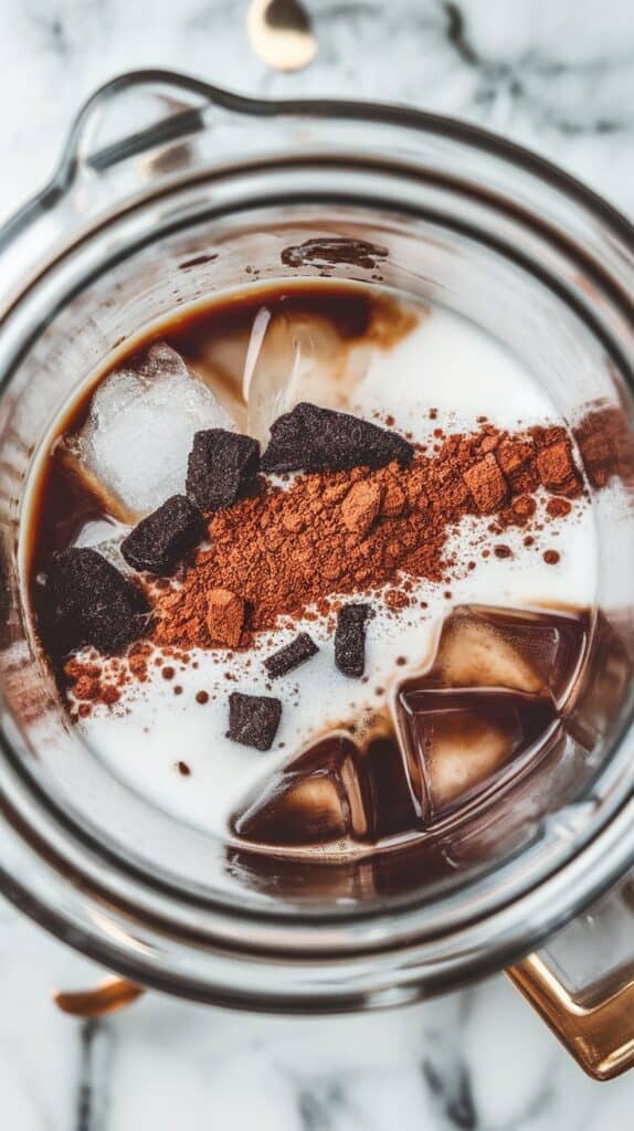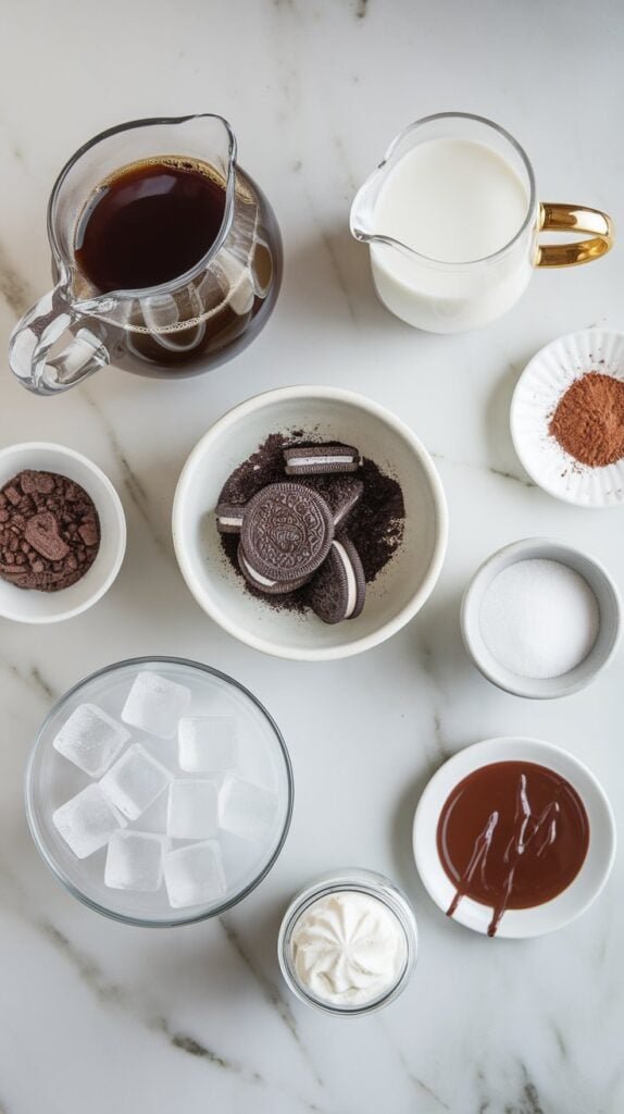 You’ll blend brewed coffee, crushed Oreos, cocoa powder, milk, and ice until it’s thick, creamy, and just sweet enough.