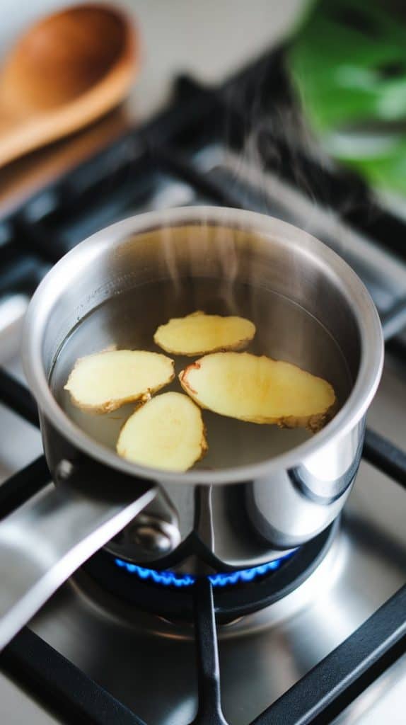 In a small pot, bring 2 cups of water to a boil. Add the sliced ginger, reduce the heat to low, and simmer for 10 minutes to infuse the water with gingery goodness.