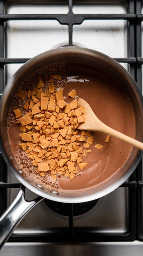 Stir in 3 crushed ginger snap cookies and 1/4 teaspoon vanilla extract. Keep stirring until the crumbs melt into the cocoa and the mix is creamy and thick.